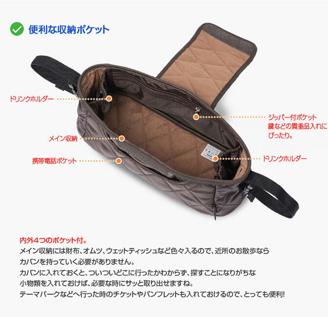 そんな思い、全てに応えるベビーカー用小物入れとドリンクホルダーです。